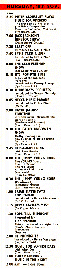 , Top pops, Pops till midnight, Sam Costa's Corner, Teen and Twenty Disc Club, David Jacobs Show, The Peter Murray Show, Brian Matthew's Pop parade, Simon's Scene.